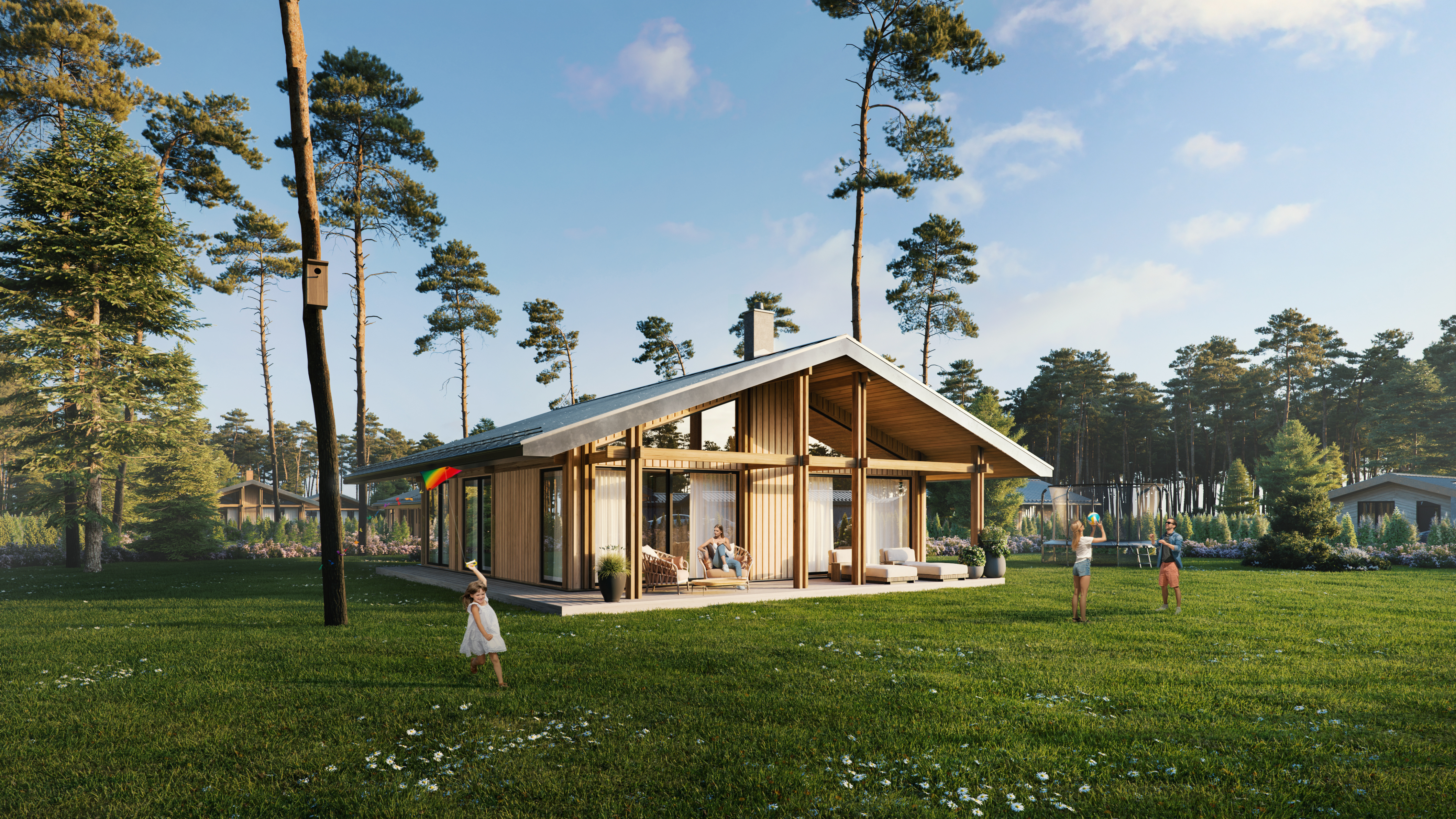 The load-bearing structure is designed using modern, energy-efficient materials. The homes feature walls made of timber elements, and the roof structure consists of wooden trusses.